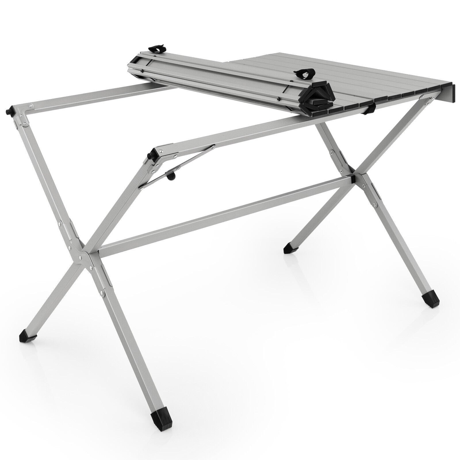 When you open the package; this camping table is all ready for you to carry because the roll-up tabletop and the folded frame are well packed in the carrying bag. Therefore; you can put it in your trunk for your wonderful outdoor trip. And the installation of this outdoor folding table will be very fast without using any tools. What's more; the selected aluminum material makes this camp table withstand changing weather so that you can leave it outside if you want to rest in the tent. The sturdy triangular constructions and anti-slip foot pads keep this aluminum folding table stable.