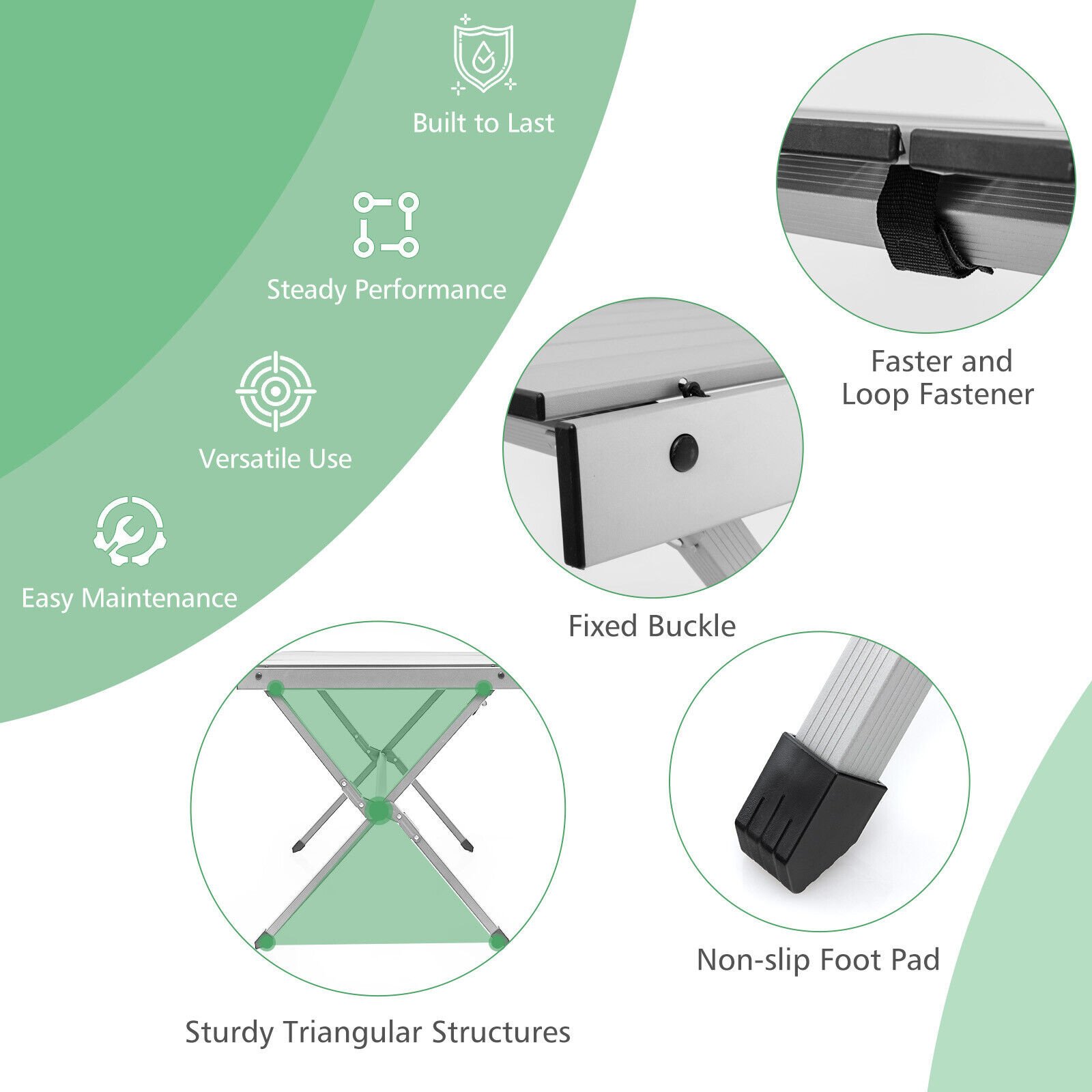3.Steady Performance: This roll-up table is designed with sturdy triangular structures and a reinforced crossbar that will stand firm to hold up to 176 lbs. Besides, the large tabletop accommodates 6 people at once. During use, the faster and loop fasteners, as well as the fixed buckles prevent the tabletop from falling.